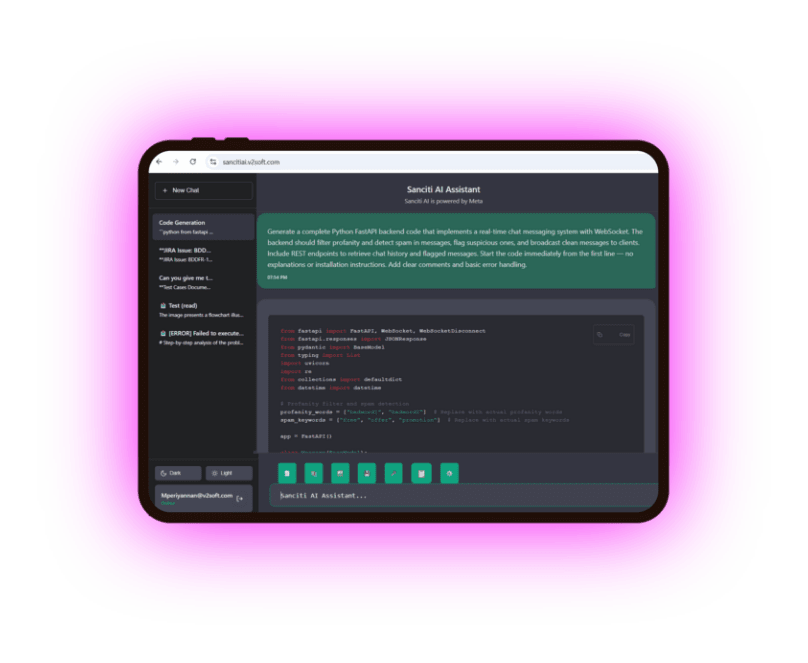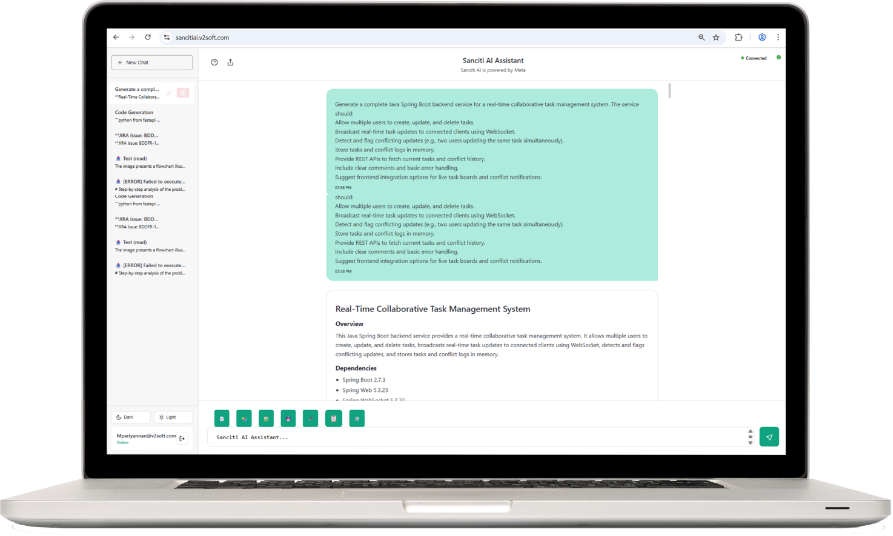 SancitiAl is the leading generative Al framework that incorporates code generation, testing automation, document generation, reverse engineering, with flexibility and scalability.