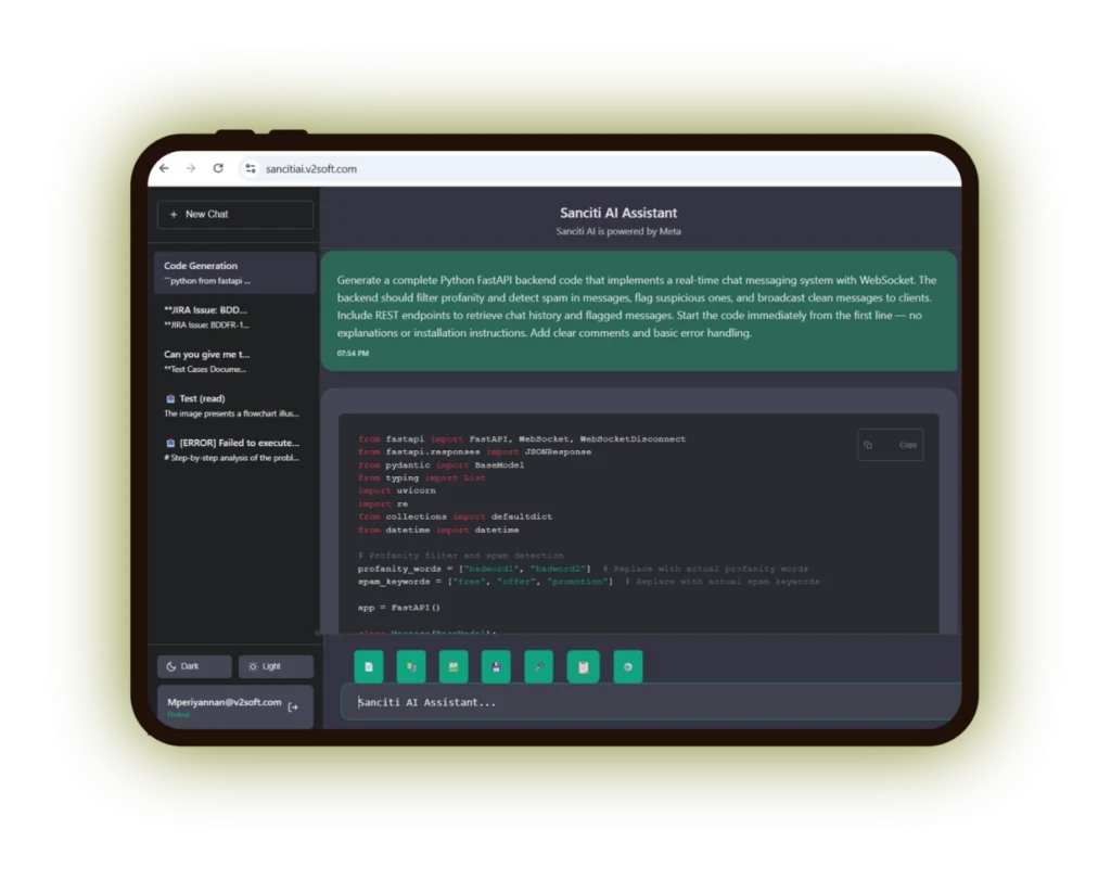 SancitiAl is the leading generative Al framework that incorporates code generation, testing automation, document generation, reverse engineering, with flexibility and scalability.